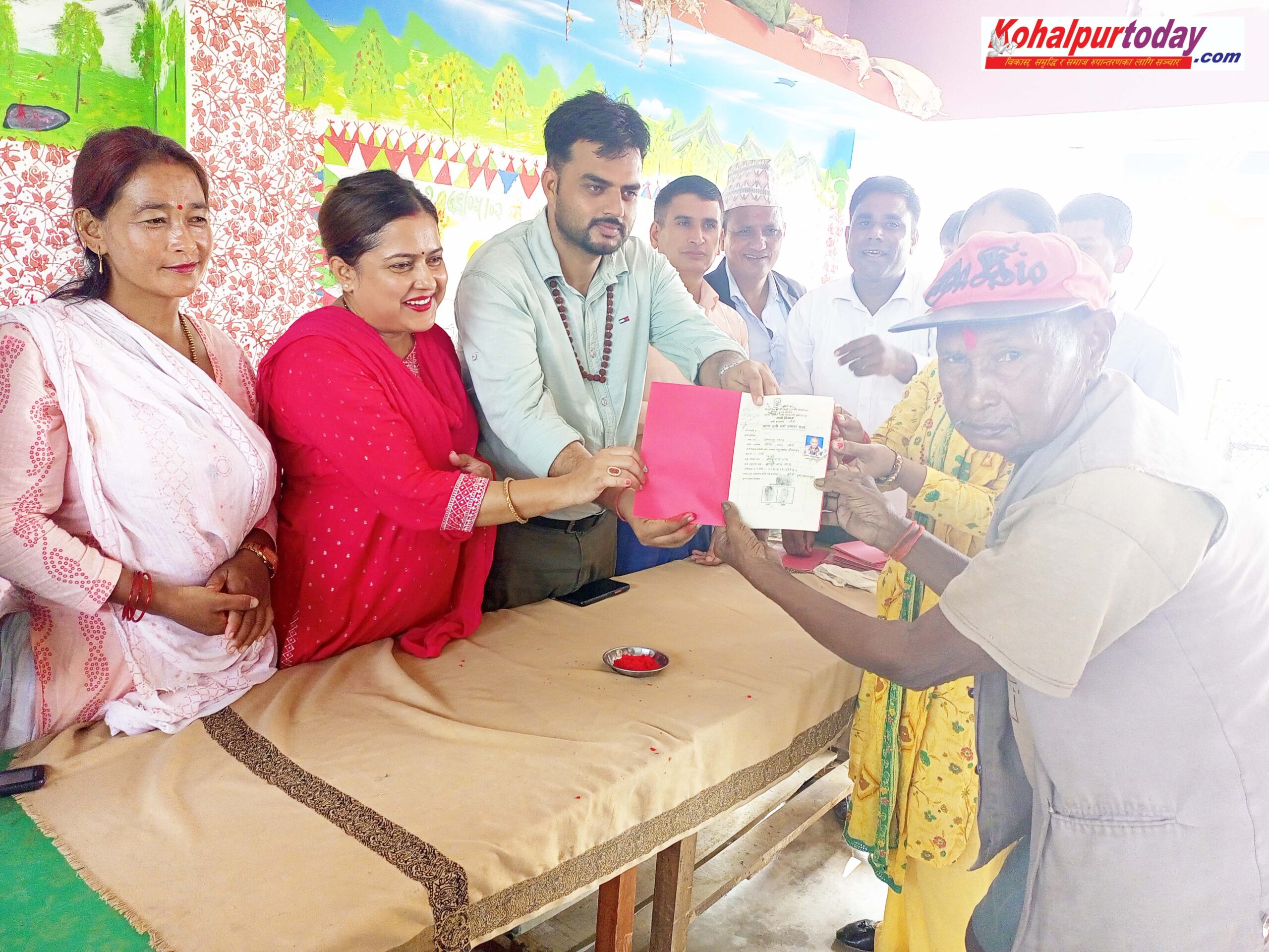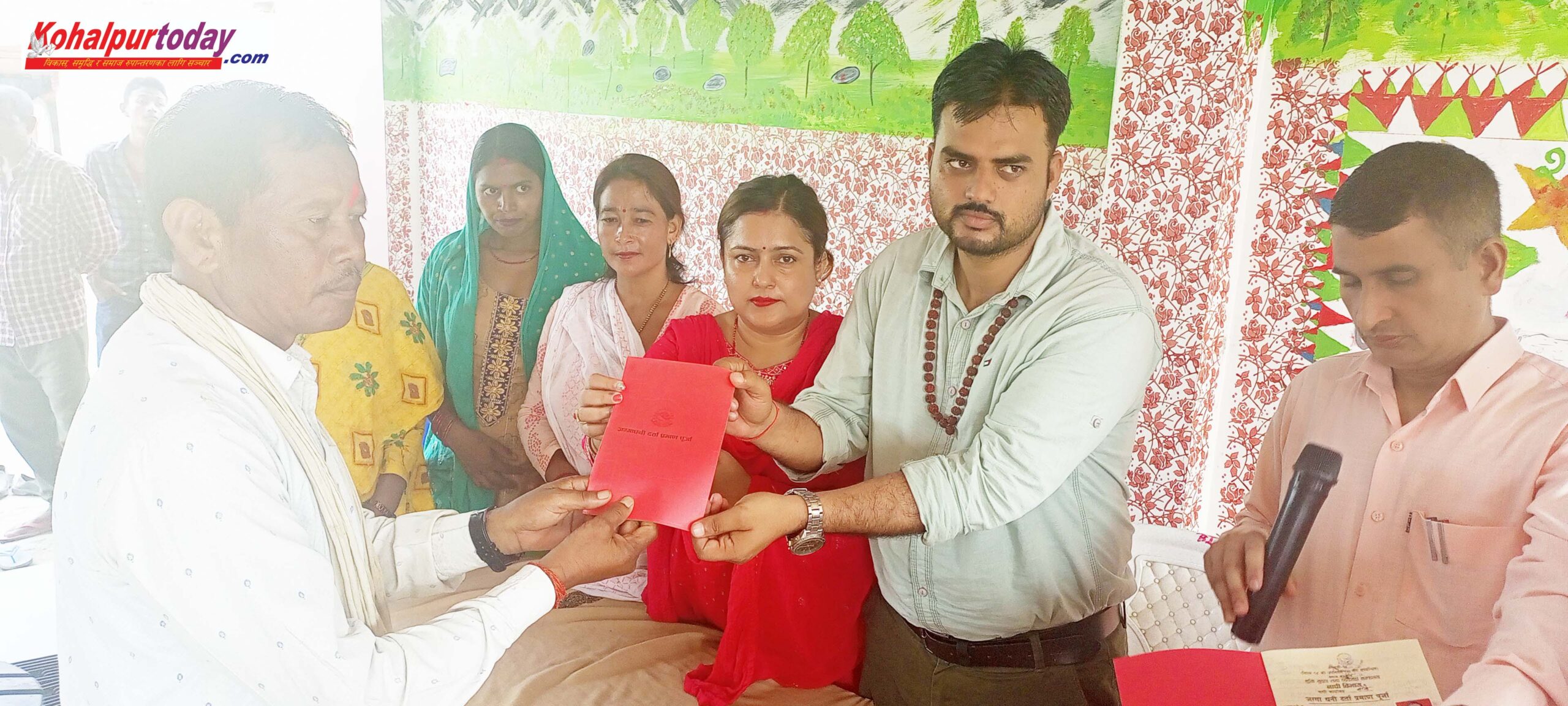 बुधबार कोहलपुर नगरपालिका प्रमुख पूर्ण प्रसाद आचार्य, उपप्रमुख संगिता सुवेदी र ४ का वडा अध्यक्ष मुबारक अलि गुजरले संयुक्त रुपमा १ सय १ लाई जग्गा धनी लालपूर्जा वितरण गरिएको हो ।