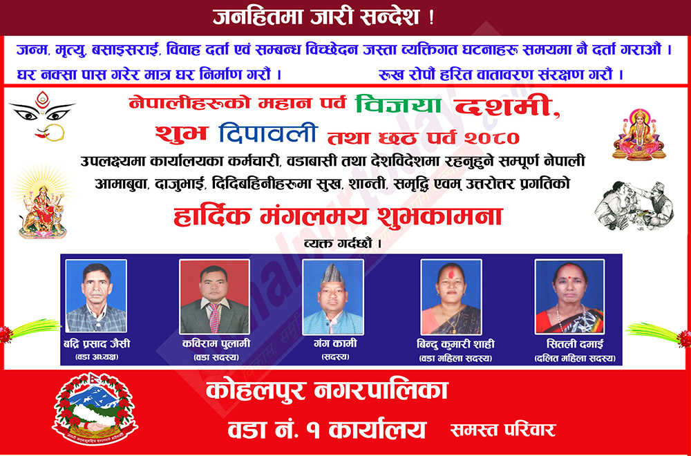 कोहलपुर नगरपालिका वडा नं. १ द्धारा विजया दशमी तथा शुभ दिपावलीको शुभकामना !