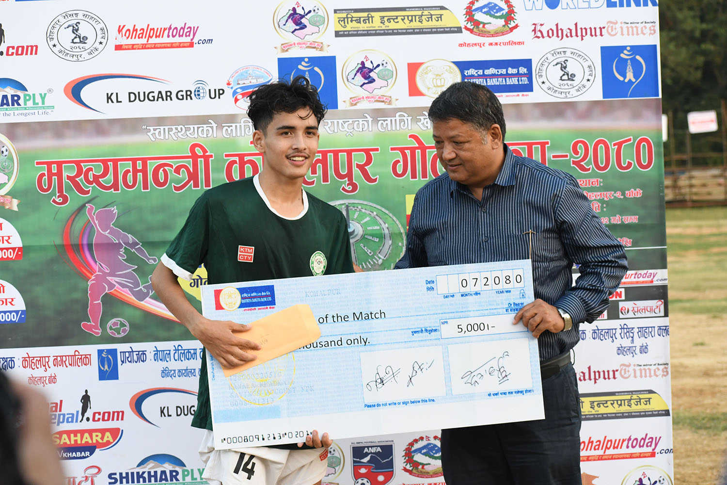 ‘मुख्यमन्त्री कोहलपुर गोल्ड कप २०८०’ प्रतियोगिता विहिबार भएको खेलमा सुदरपश्चिम-११ धनगढीलाई गोर्खा व्वाईज स्पोर्ट क्लब बुटवलले १-० ले पराजित गर्दै विजयी भएको छ ।