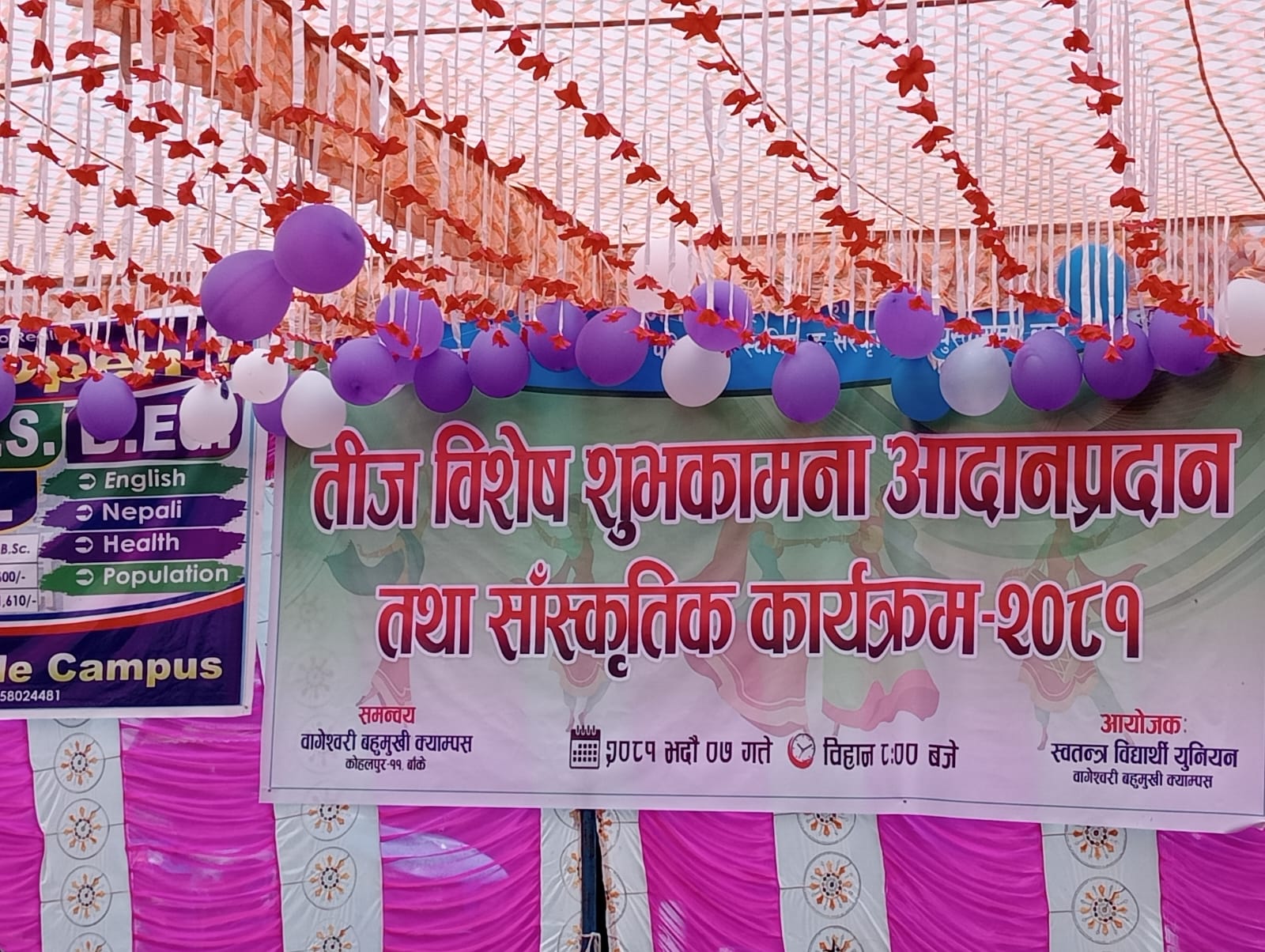 मध्यपश्चिम विश्वविद्यालय वागेश्वरी बहुमुखी क्याम्पस कोहलपुर स्वतन्त्र विद्यार्थी युनियनको आयोजना र क्याम्पस प्रशासनको समन्वयमा तिज विशेष कार्यक्रम सम्पन्न गरेको छ । हिन्दू नारीहरुको महान पर्व हरितालिका तिज कार्यक्रम गरिएको हो ।