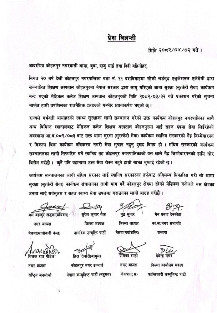 नेपाल सरकारद्वारा लागूू गरिएको बिमा सुरक्षा (सुत्केरी सेवा) कार्यक्रम बन्द भएको मेडिकल कलेज शिक्षण अस्पताल कोहलपुरको ३२ गते सूचना प्रकाशन गरेपछि आठ राजनैतिक दलहरुले गम्भीर ध्यानाकर्षण जनाउँदै विज्ञप्ती सार्वजनिक गरेका छन् ।