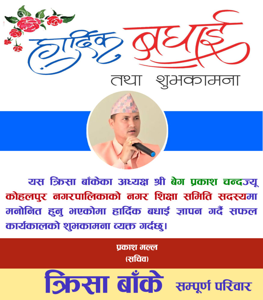 कोहलपुर । बाँकेको कोहलपुर नगरपालिका शिक्षा समितिको सदस्यमा वेग प्रकाश चन्द मनोनित भएका छन् । क्रिसा बाँकेका अध्यक्ष समेत रहेको चन्द शुक्रबार कोहलपुर नगरपालिकाले शिक्षा समितिको सदस्यमा मनोनित गरेको हो ।