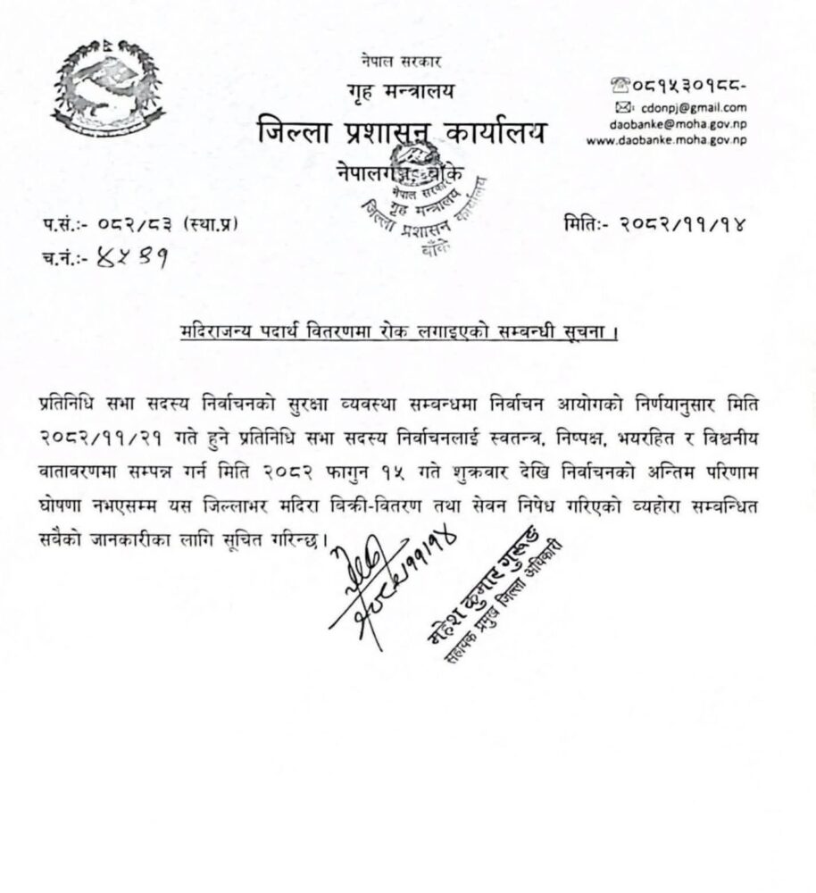 सूचनाअनुसार निर्वाचन आयोग को निर्णय बमोजिम मिति २०८२ मंसिर २९ गते हुने प्रतिनिधि सभा सदस्य निर्वाचनलाई स्वतन्त्र, निष्पक्ष, भयरहित र मर्यादित वातावरणमा सम्पन्न गर्न मिति २०८२ फागुन १५ गते शुक्रबारदेखि निर्वाचनको अन्तिम परिणाम घोषणा नभएसम्म मदिरा बिक्री–वितरण तथा सेवन पूर्णरूपमा निषेध गरिएको हो।