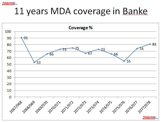 उनका अनुसार कोहलपुर नगरपालिका–५ र ६ को रझेना गाउँमा सर्वे गर्दा अझै सन् २०१९ मा १८ प्रतिशत रहको थियो भने अहिले २०२२ मा ५.५ प्रतिशत छ । तर अहिले रझेना गाउँमा १ दशमलब भन्दा कम हुनुपर्ने फोेकल पर्सन दुर्गा गौतमले बताइन् । यस्तै नेपालगञ्जको –४ स्थित सल्यानीबाग गाउँमा समेत निर्वारण हुन सकेको छैन । सन् २०१९ को तथ्थांक भन्दा सन् २०२२ मा २५ प्र्रतिशत मात्र घटेको देखिन्छ । तर बाँकेमा ११ वर्षसम्म निर्वारण हुनुपर्ने उनी बताउँछिन् ।