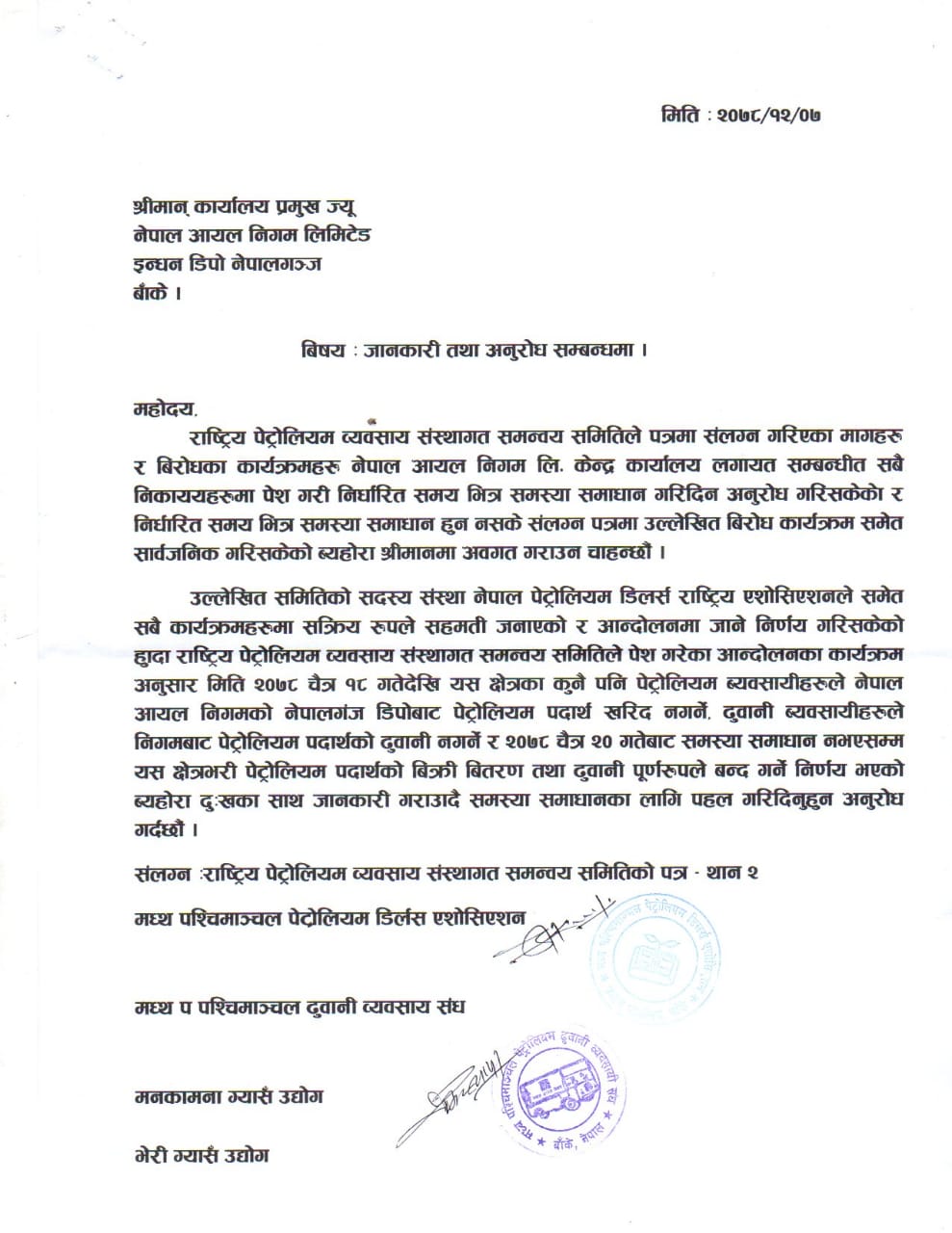 बाँके लगायत विभिन्न जिल्लाहरुमा रहेका पेट्रोलियम डिलर्सहरुले ६ बुँदे माग राख्दै पेट्रोलियम पम्पहरु बन्द गर्ने चेतावनी दिएका छन् । मंगलबार मध्यपश्चिम पेट्रोलियम डिलर्स एशोसिएसन, मध्यपश्चिम पेट्रोलियम ढुवानी व्यवसायी संघ, मनकामना ग्याँस उद्योग र भेरी ग्याँस उद्योगले संयुक्त रुपमा बाँकेका प्रमुख जिल्ला अधिकारी सुर्य बहादुर घर्तीलाई ज्ञापन पत्र बुझाएका थिए ।