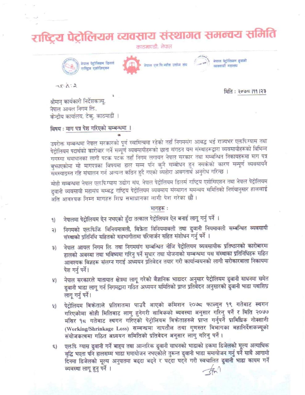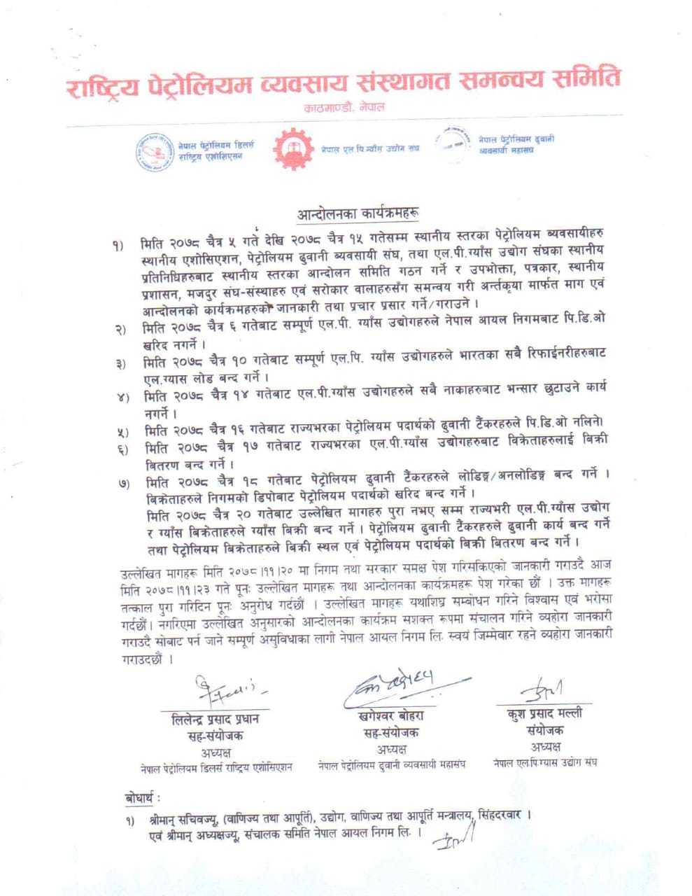 मध्यपश्चिम पेट्रोलियम डिलर्स एशोसिएसनका अध्यक्ष विश्वराज खनालले ६ बुँदे माग राख्दै आन्दोलनका कार्यक्रमहरु समेत धोषणा गरिएको बताए । खनालका अनुसार चैत १० गतेदेखि एल.पि. ग्याँस उद्योगहरुले भारतका रिफाईनरीहरुबाट एल.पि. ग्याँस लोड गर्ने बन्द गर्ने, १४ गते सबै नाकाहरुबाट भन्सार छुटाउने कार्य बन्द गर्ने, १६ गते पेट्रोलियम पदार्थको ढुवानी टैंकरहरुले पि.डि.यो. नलिने, १७ गते विभिन्न उद्योगहरुबाट ग्यासहरु विक्रि वितरण नगर्ने, १८ गते पेट्रोलियम ढुवानी टैंकरहरुले लोडिङ्ग/अनलोडिङ्ग बन्द गर्ने र २० गते मागहरु पुरा नभए देशभरीका पेट्रोलियम, ग्याँस विक्रेता, ढुवानी कार्यसमेत पूर्ण रुपमा बन्द गर्ने लगायतका मागहरु रहेका उनी बताउँछन् ।