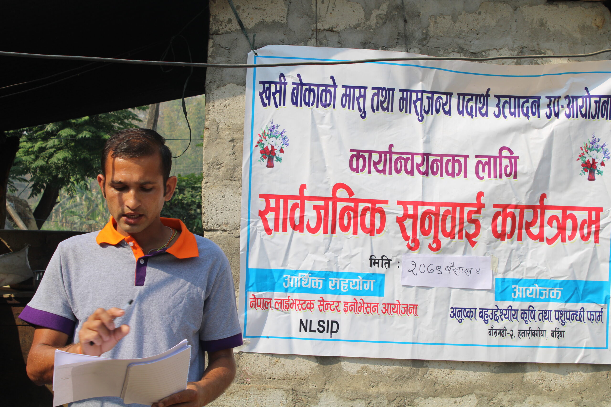 उप–आयोजना कार्यान्वयनका लागि आईतवार सार्वजनिक सुनुवाई कार्यक्रम समेत गरिएको छ । कार्यक्रममा कृषि तथा पशुपन्छी फर्मका संञ्चालक कमल खत्रीले आयोजनाको बारेमा जानकारी दिनुभयो । उहाँले ६० लाख १ हजार ५ सय २४ रुपैया कुल लागत मध्य आयोजनाको अनुदान ३० लाख ७ सय ६२, नेपाल इन्भेष्टमेन्ट बैक लिंको १८ लाख ४ सय ५८ ऋण लगानी र १२ लाख ३ सय ५ फर्मले लगानी गरेको जानकारी दिनुभयो ।